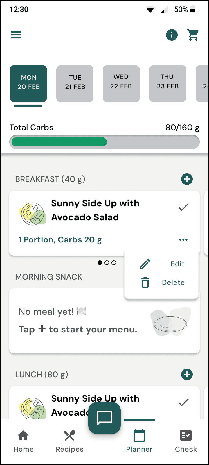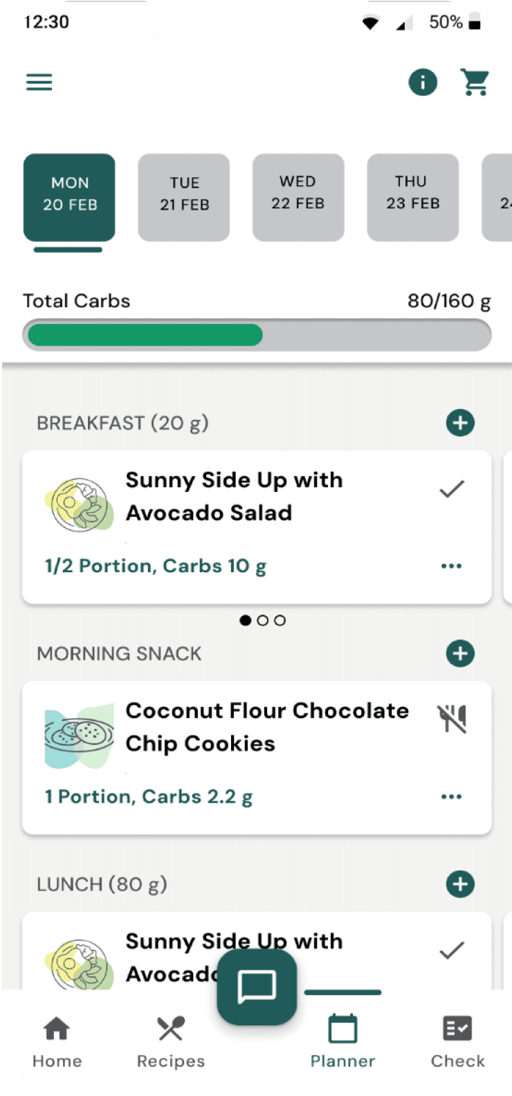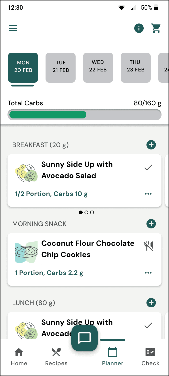 The carb progress indicator in the planner was placed at the bottom, requiring users to scroll to the last meal to check progress.