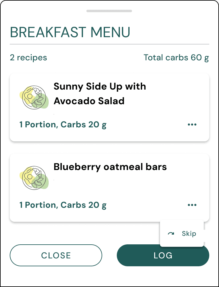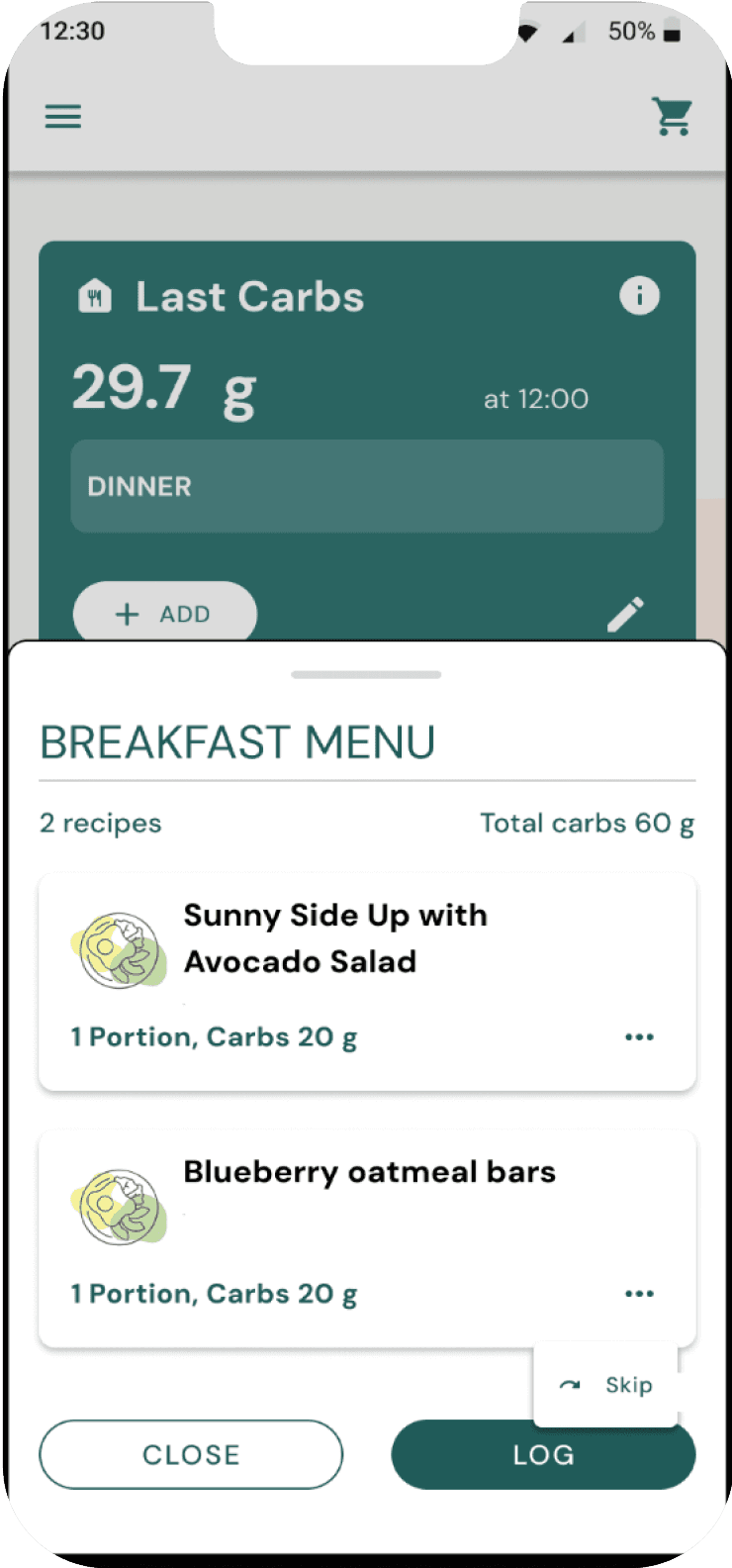 The bottom sheet includes a 'LOG' button for logging total carbs and a 'Skip' option if plans change