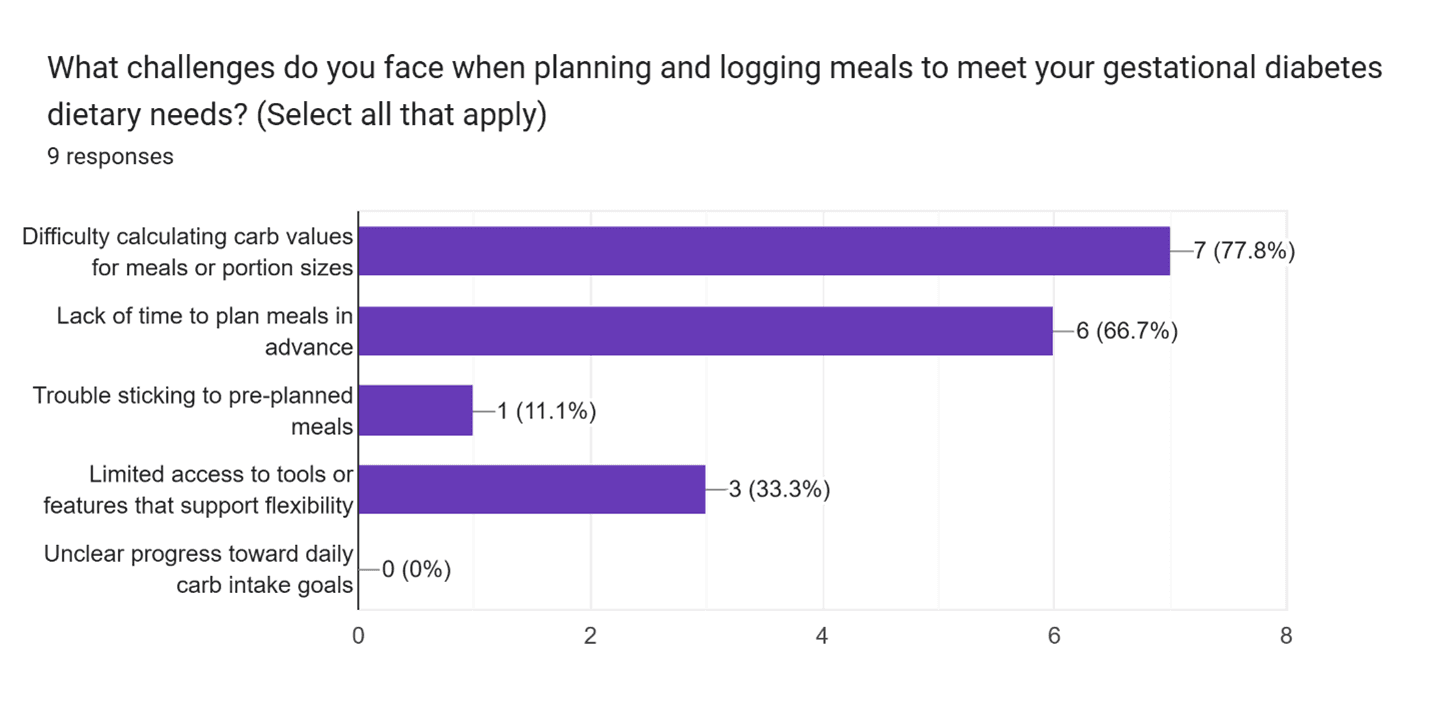 To validate our assumptions, I surveyed participants with gestational diabetes to assess meal tracking habits, carb counting challenges, and feature preferences.