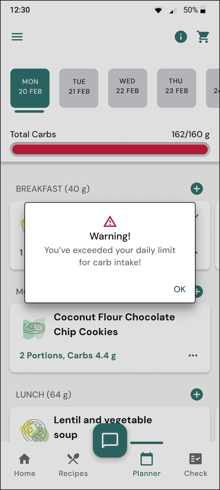 The app provides a dialog alert when users exceed their daily providing feedback to support informed meal-tracking decisions. To reinforce this, the carb progress bar changes to red, offering a clear visual cue. Additionally, the app includes semantic descriptions for the progress bar (e.g, 'You have consumed 31g of carbohydrates out of your 160g daily goal. Your carb intake for the day is at 19%), ensuring accessibility for users with visual impairments.